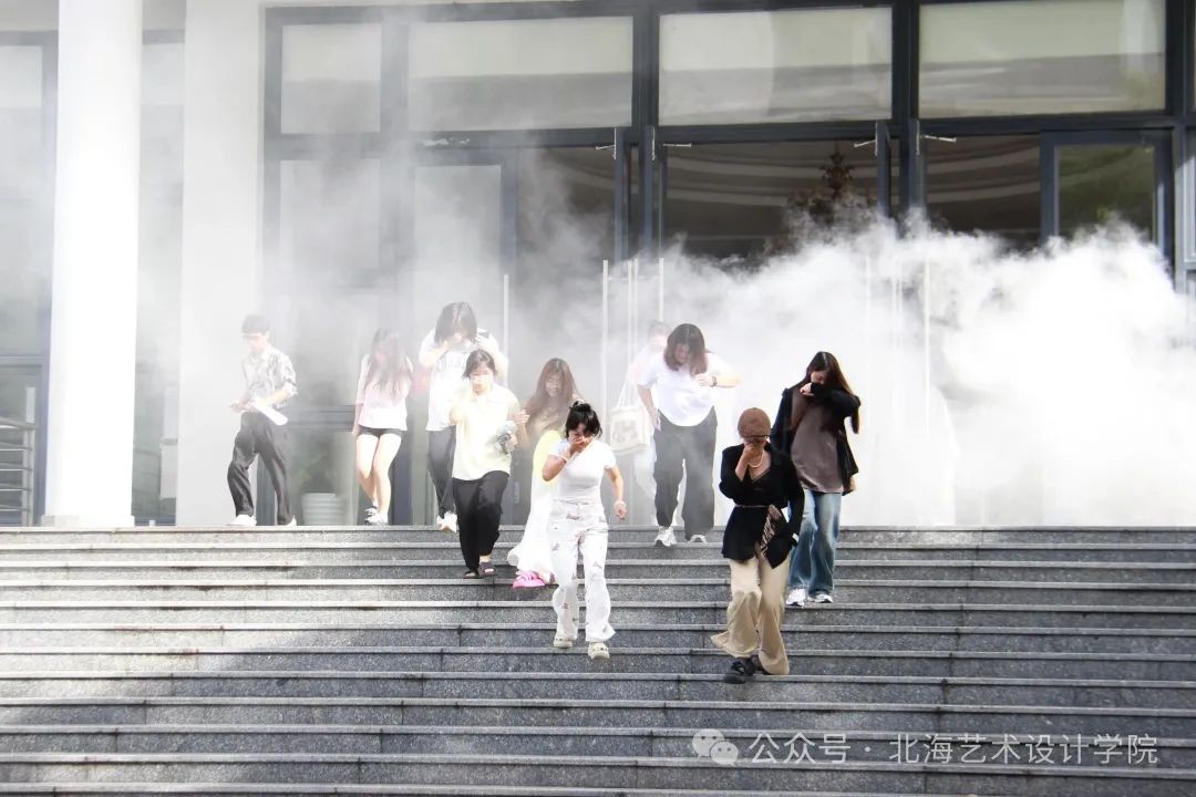 随后,图书馆消防疏散演练拉开帷幕。美术学院学生代表在图书馆、保卫处工作人员的引导下,用湿毛巾捂住口鼻,弯腰低姿,按照预定疏散路线,从图书馆阅读室迅速、有序地疏散至图书馆北门前。整个演练过程紧张有序,学生们动作规范,展现出良好的应急反应能力,达到了预期的演练效果。