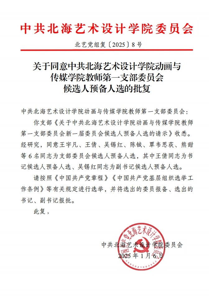 关于同意中共北海艺术设计学院动画与传媒学院教师第一支部委员会候选人预备人选的批复