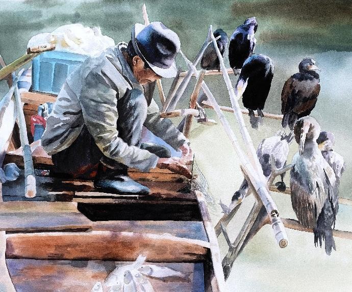 绘画 1906 班 徐妹丁《打鱼人》76×55cm 水彩 指导教师:刘广滨、段凝