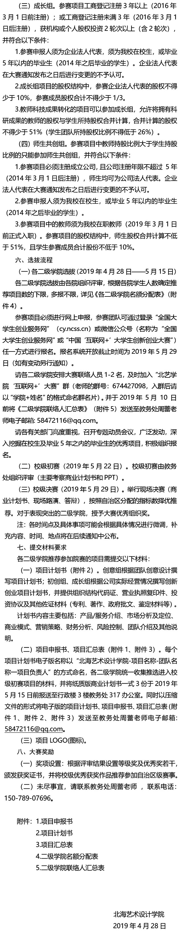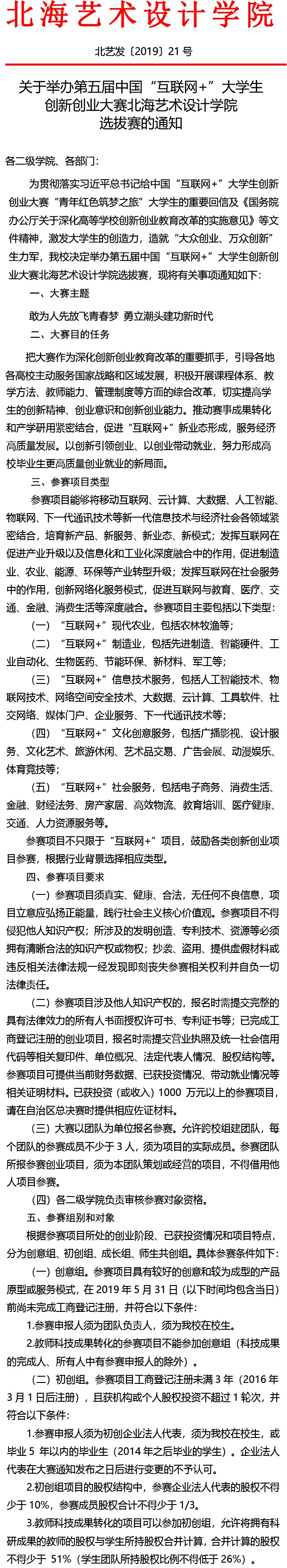关于举办第五届中国“互联网+”大学生创新创业大赛北海艺术设计学院 选拔赛的通知