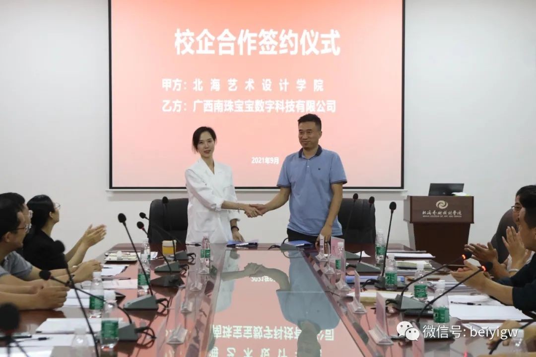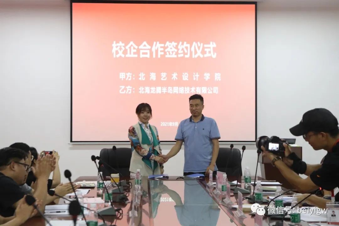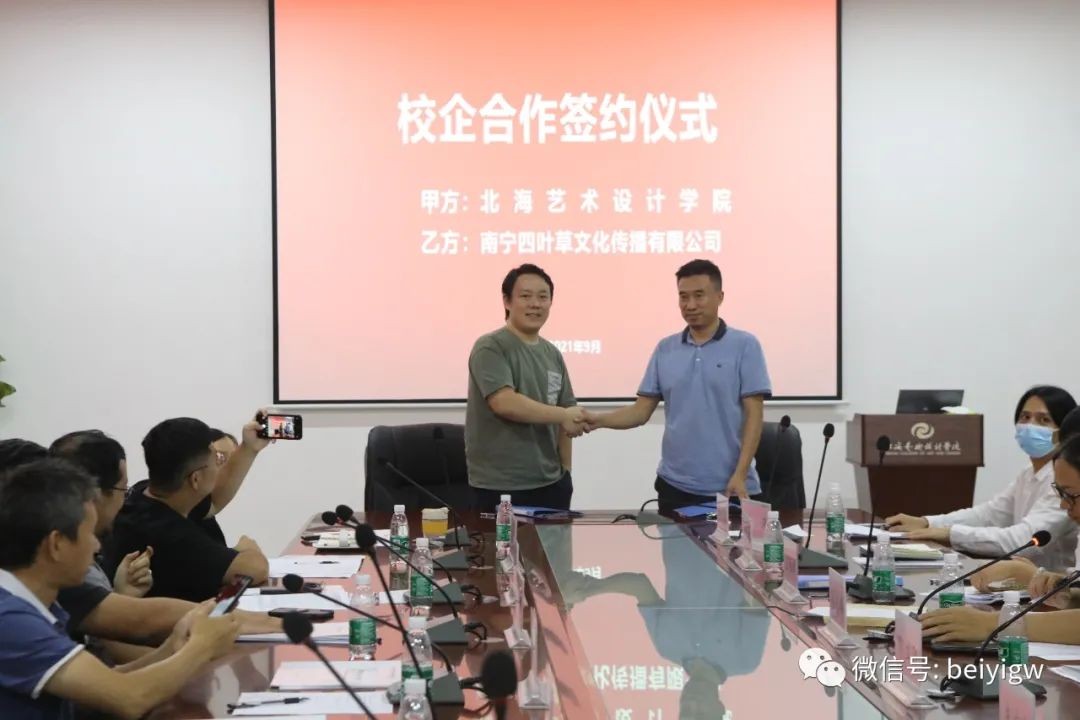 会上,动画与传媒学院分别与南宁四叶草文化传播有限公司北海华彩影视文化传媒有限公司、北海龙腾半岛网络技术有限公司、广西南珠宝宝科技有限公司、广西蔓延影视传媒有限公司签订了校企合作协议。