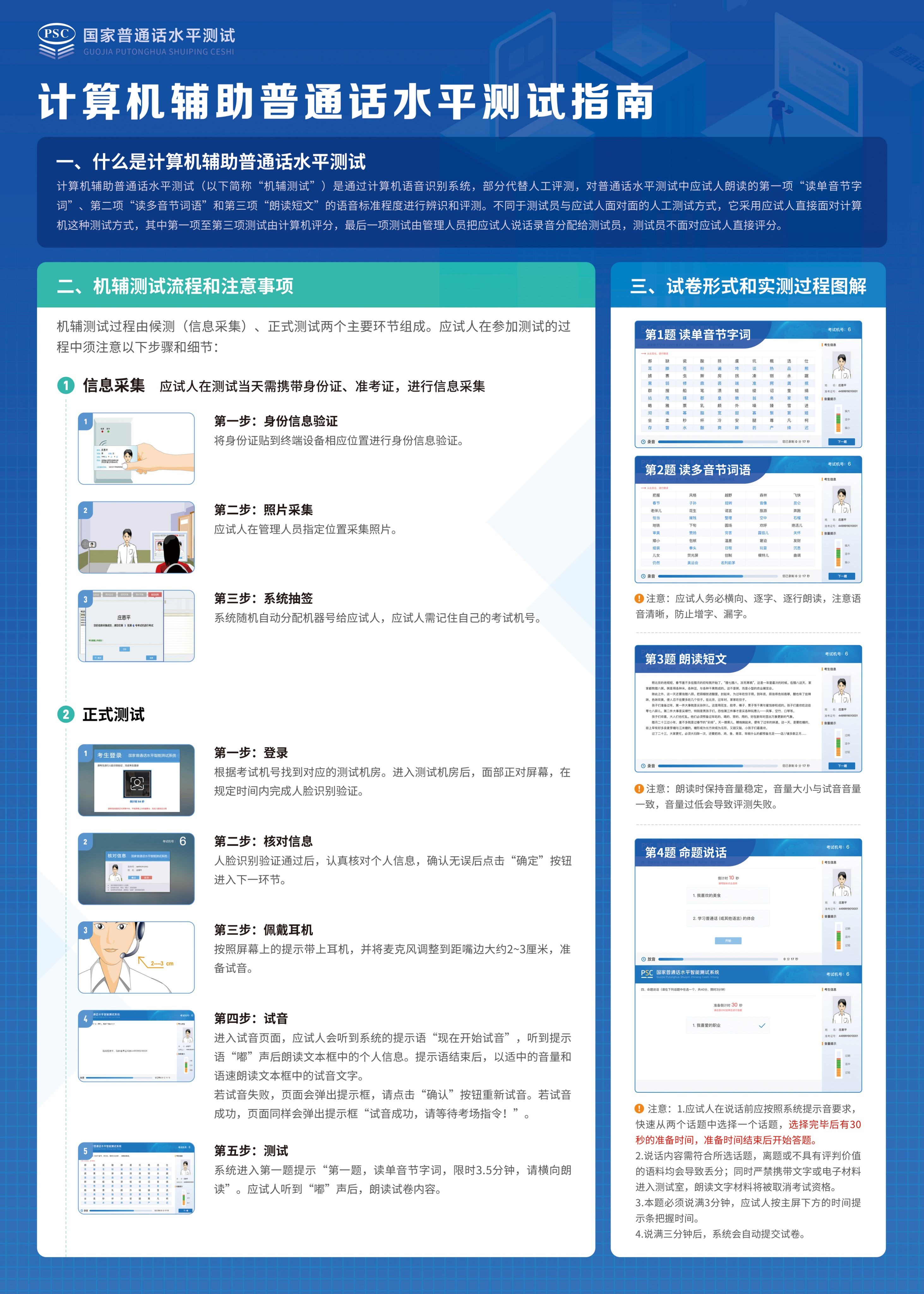 (二)考试流程。具体考试流程按照计算机辅助普通话水平测试指南(附件1)、普通话水平测试考试指南(附件2)执行。