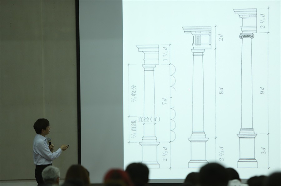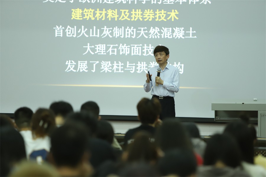 李沙教授以欧洲建筑的精神文明及其材料运用引入,讲述了古罗马建筑的两大特点——宏伟和永恒。他表示,罗马文化灿烂辉煌,其建筑所呈现的形式也是宏伟庄严,在用料上多采用石料、火山灰等耐腐蚀材料,从而使得古罗马建筑得以长久发展。李沙教授还从建筑细节对古罗马建筑进行详细介绍,古罗马建筑继承了古希腊建筑的精华,并将其发扬光大,其五种经典柱式设计彰显着理性思想,形成了古罗马建筑的鲜明特色。