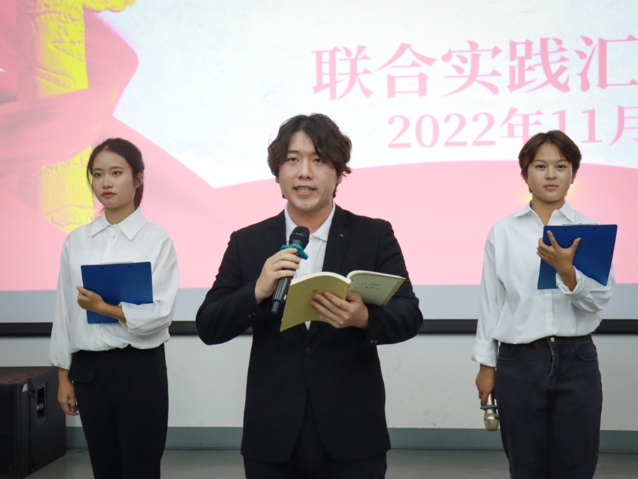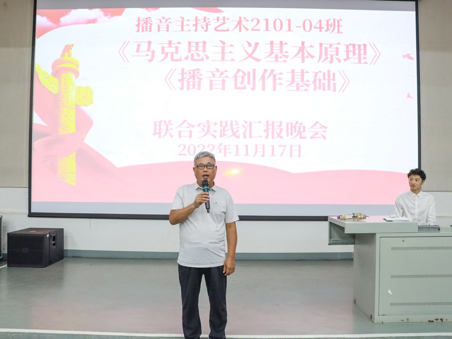 11月17日晚,依托马克思主义学院和动画与传媒学院共建的思政课实践教学研习基地——红色播音创作室,以朗诵演出的形式,在公德楼107联合举行了《马克思主义基本原理》与《播音创作基础》课程实践教学成果展示汇报会。马克思主义学院院长姜献生教授、动画与传媒学院副院长杨红夷副教授莅临指导。播音与主持艺术专业2021级全体学生参加,两门课程的教研室主任及任课老师也亲临现场。