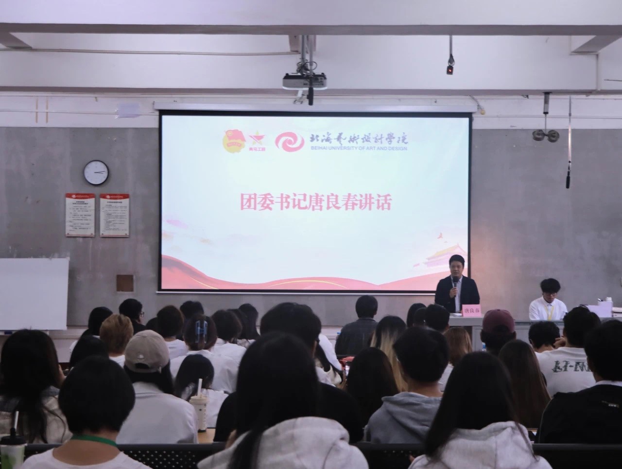 出席开班仪式的嘉宾有学校团委书记唐良春、副书记杨美琪,团委组织部部长王燕亭,书法学院分团委书记李家琪,设计艺术学院分团委书记王慧、副书记覃轶科,社管部副部长张纭逢,校团委老师们以及校级青马班学员们。