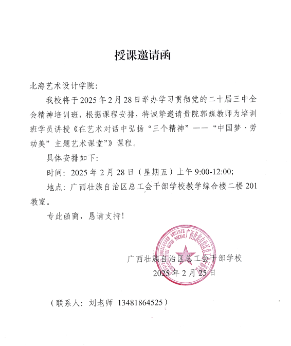 2025 年 2 月 28 日,我校青年教师郭巍受邀赴广西壮族自治区总工会干部学校,为其全体教师 学习贯彻党的二十届三中全会精神培训班” 作专题讲座,讲座主题为《在艺术对话中弘扬 “三个精神”——“中国梦・劳动美” 主题艺术课堂》。