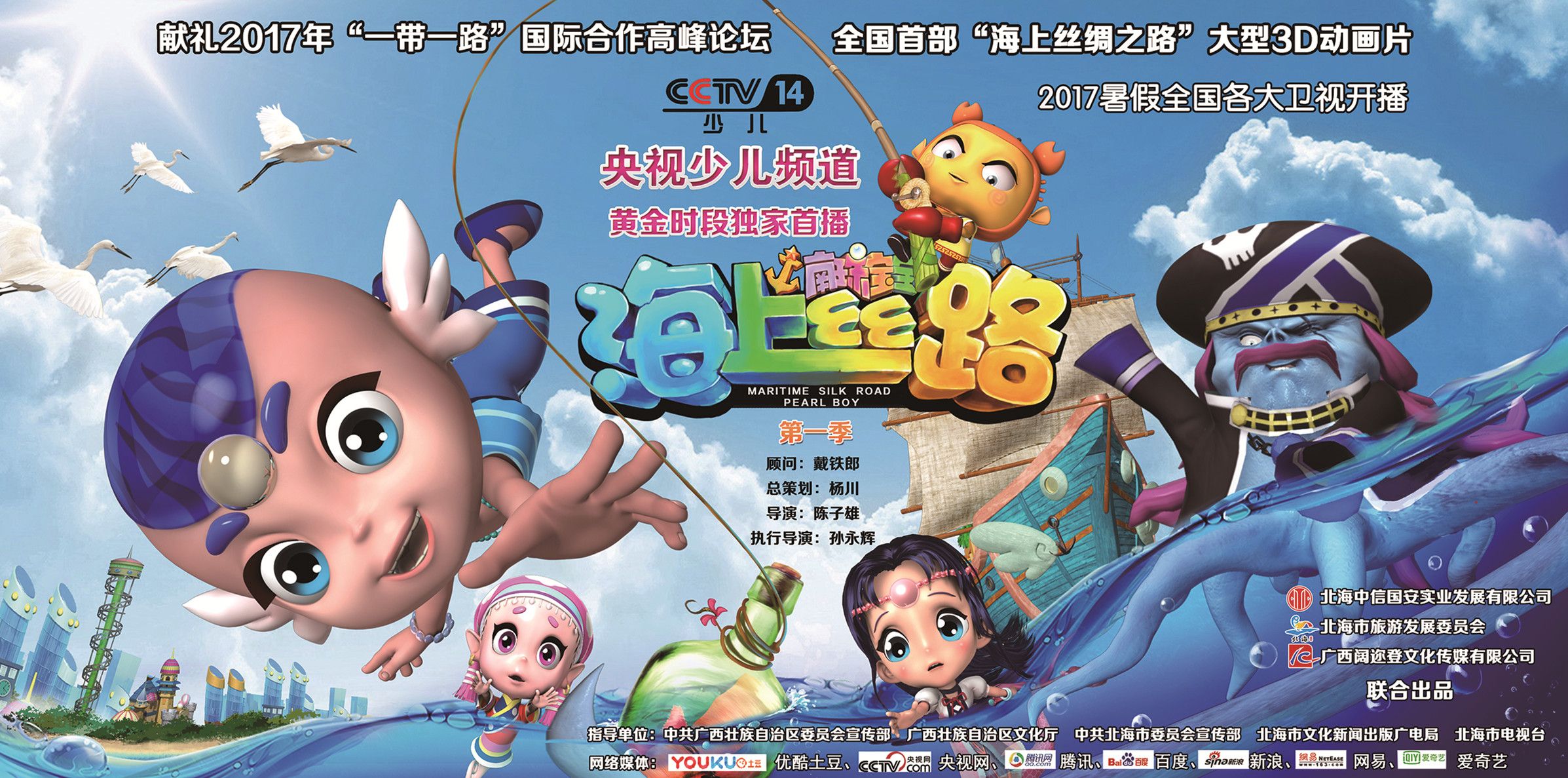《海上丝路南珠宝宝》动画片总投资3000万元,制作39集,每集12分钟,由国家认定动漫企业广西阔迩登文化传媒有限公司与北海艺术设计学院共同设计制作。是全国首部“一带一路”海上丝绸之路大型3D动画片。《海上丝路南珠宝宝》作品登陆中央电视台少儿频道、广西卫视及全国多家星级卫视、腾讯、优酷等媒体播出。获得广西第十四届精神文明建设“五个一工程”优秀作品奖,被评为广西首部优秀原创动画作品,是自治区党委宣传部扶持的重点文艺精品项目,国家文化出口重点项目。