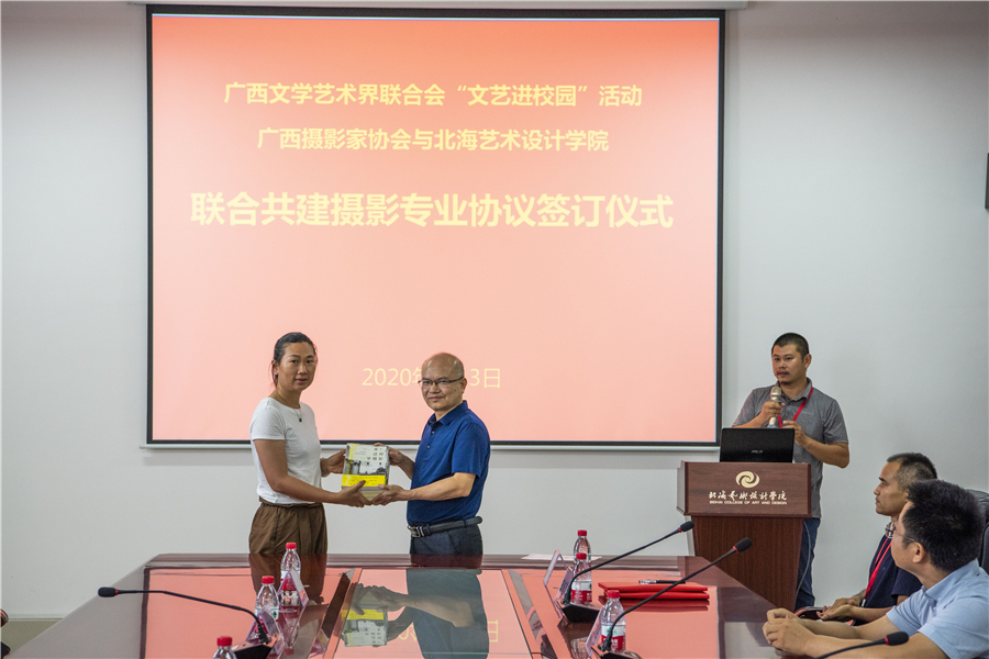 广西君人庆科技有限公司总经理、广西摄影家协会会员覃媚向我校捐赠了50册摄影书籍,党委书记李高南代表学校接受赠书。