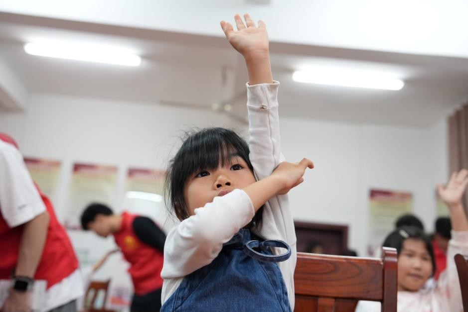 在充满欢乐的音乐课上,志愿者将动作、语言、节奏紧密结合,让学生们感受咸水歌里的岭南风情,体会不同音乐带来的多重情感。通过解析歌曲中蕴含的人文精神和家国情怀,不仅点燃孩子们对音乐探索的热情,还教会了孩子们用音符传递疍家人对生活的热爱。