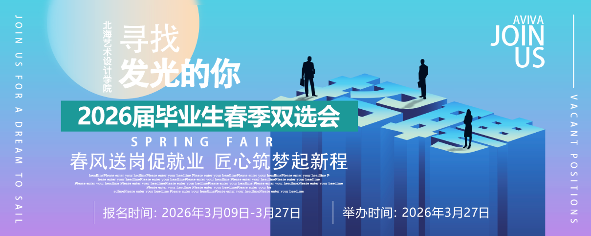 为促进我校毕业生顺利就业、尽早就业,现定于2026年3月27日于北京实践基地(北京邮电大学宏福校区、北京科技职业学院沙河校区)举办“北海艺术设计学院2026届毕业生春季双选会”(以下简称“双选会”)。诚邀各用人单位报名参加。本次双选会为公益活动,不对任何参会单位及学生收取费用,诚邀各用人单位参会选聘人才!