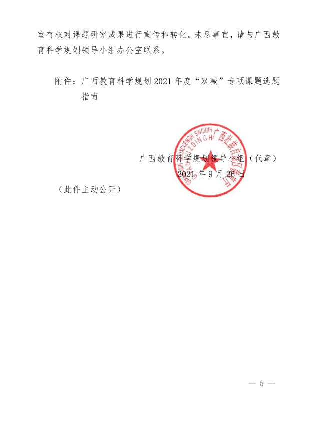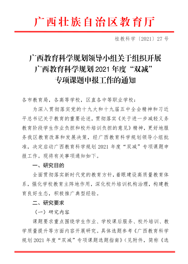 广西教育科学规划领导小组关于组织开展广西教育科学规划2021年度“双减”专项课题申报工作的通知