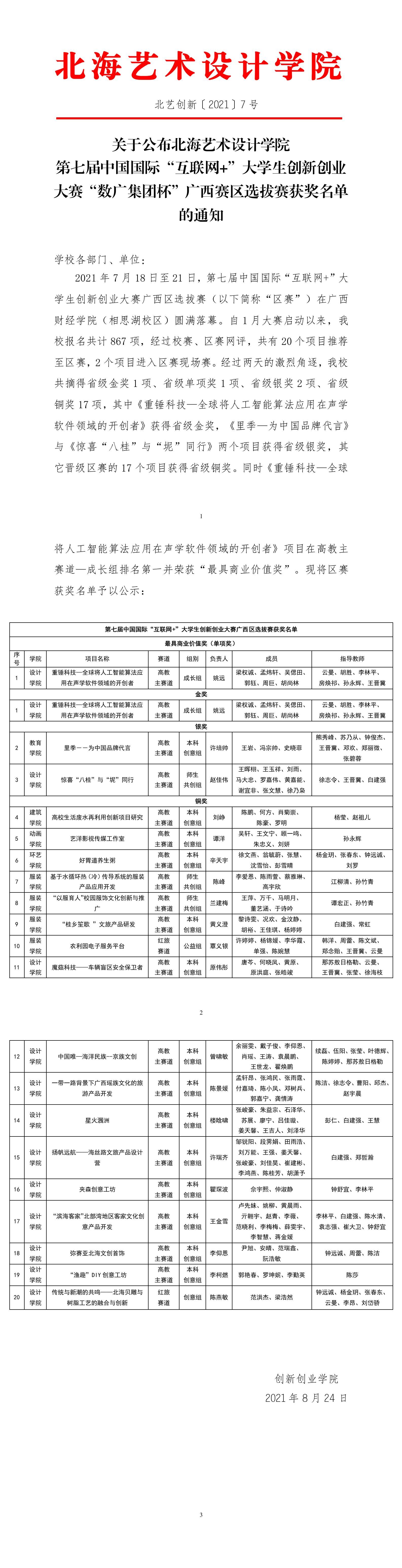 北艺创新〔2021〕7号关于公布北海艺术设计学院第七届中国国际“互联网+”大学生创新创业大赛“数广集团杯”广西赛区选拔赛获奖名单的通知