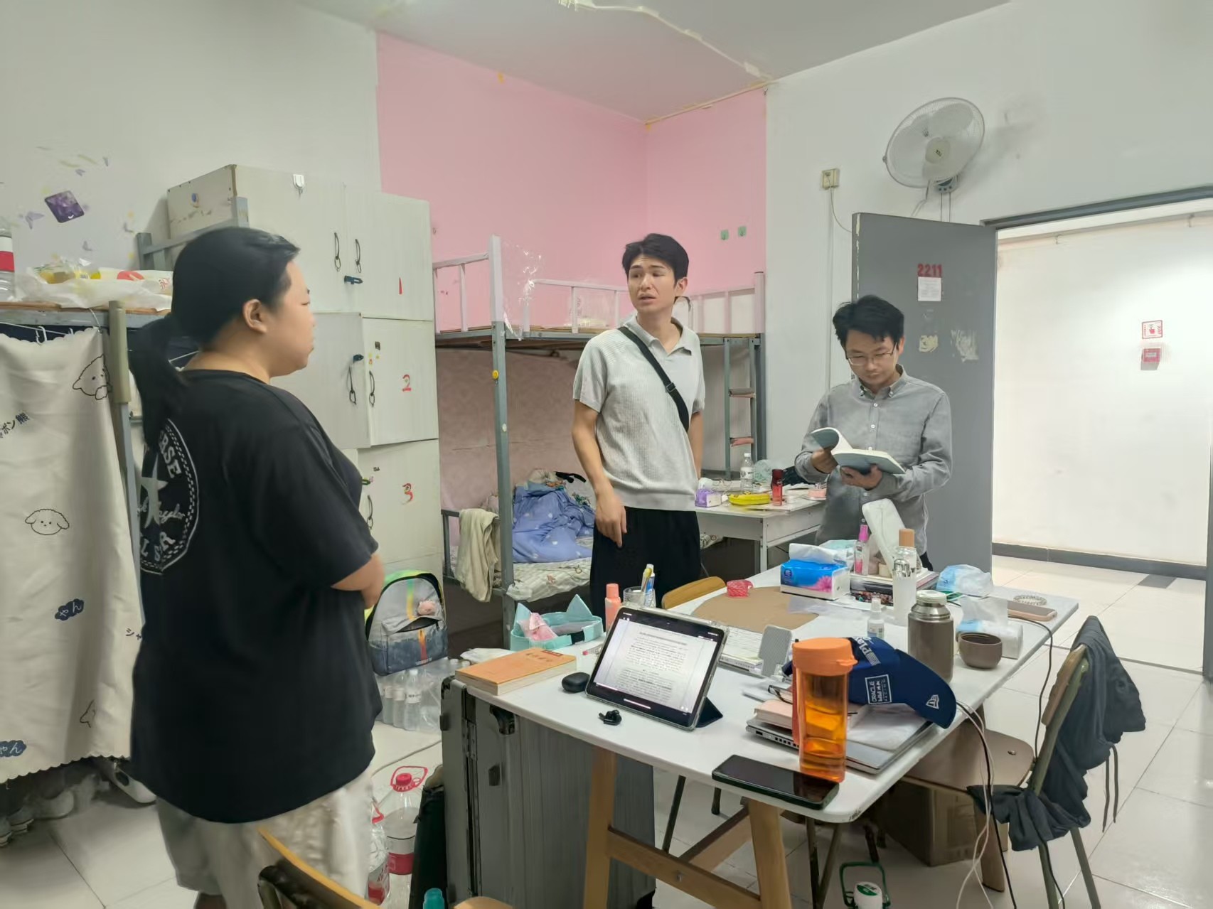 2025年8月20日下午,在北海艺术设计学院北京实践基地(宏福)的学生宿舍里,书法学院常务副院长苏乃从、党支部书记喻广林深入学生宿舍,与同学们亲切交谈,细致询问大家的学业进展、生活需求及未来规划,了解他们的学习、生活、思想状况以及实际困难,认真听取同学们对学院工作的意见和建议。