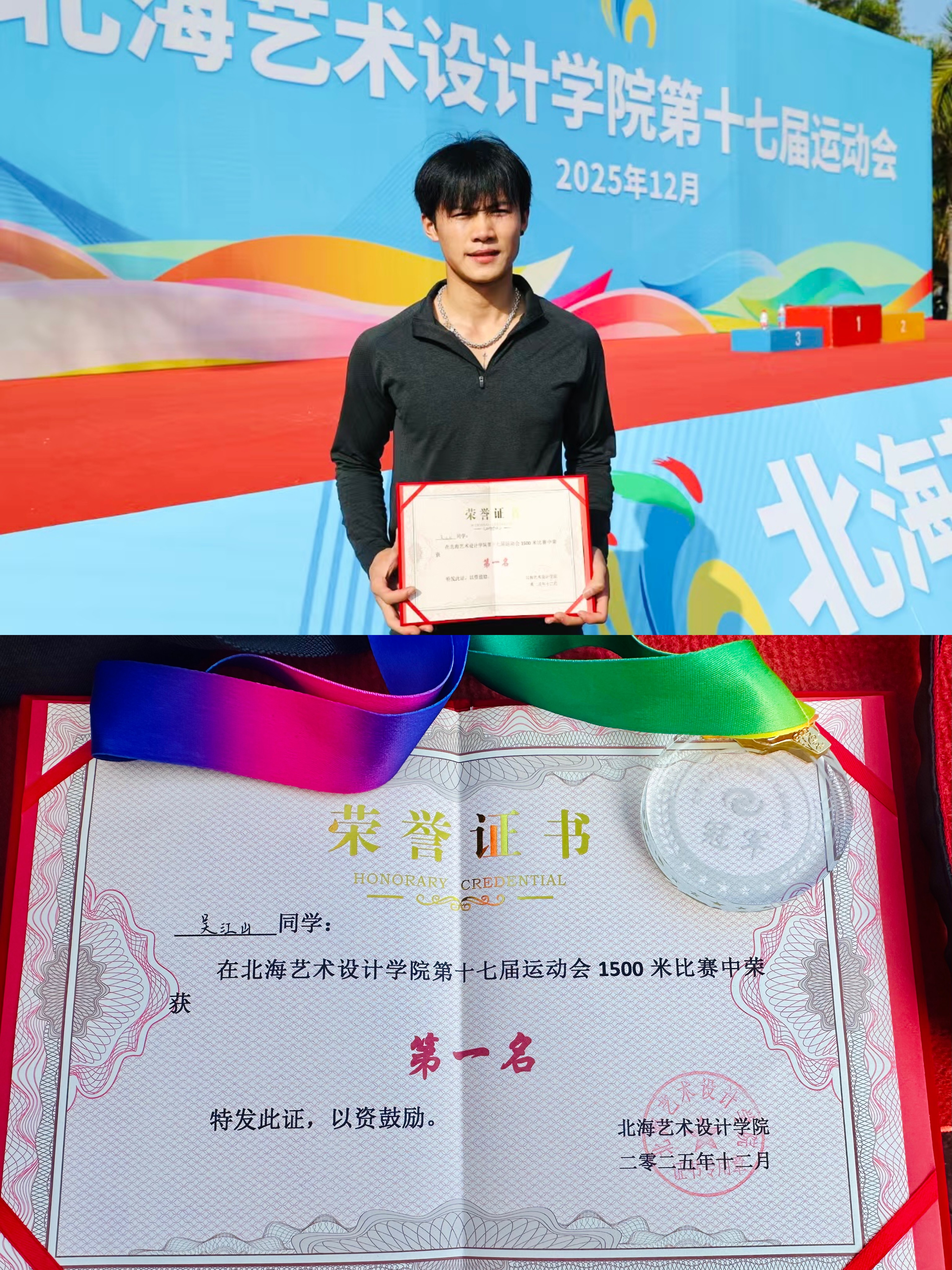 服饰2303班的吴江山同学表现尤为亮眼,他在男子800米决赛中以2分12秒26的成绩摘得第一名,又在男子1500米项目里跑出4分45秒58的佳绩,再度将第一名收入囊中。