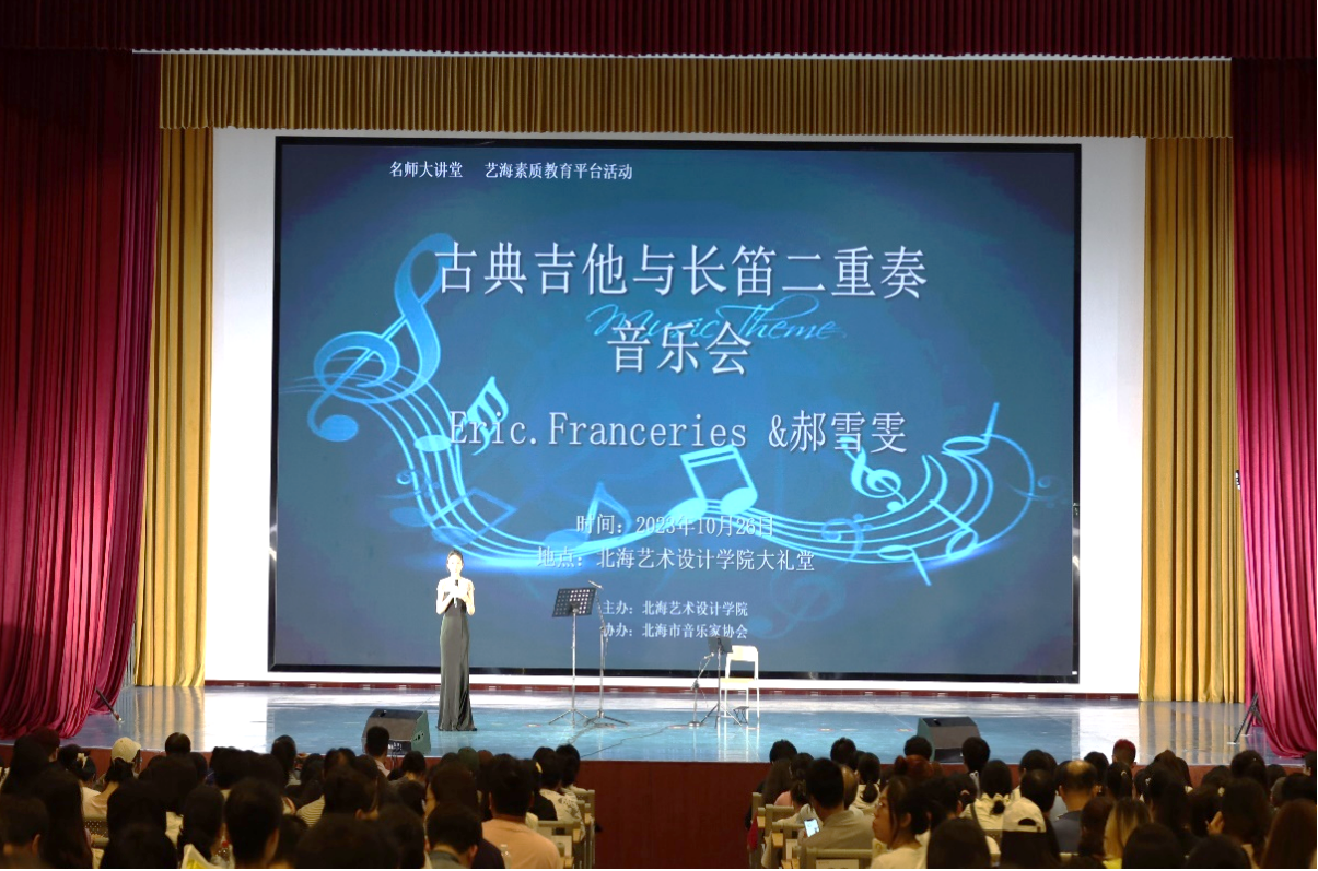 10月26日晚,北海艺术设计学院客座教授旅法长笛演奏家郝雪雯女士和古典吉他演奏家埃瑞克·弗朗塞利(Eric Franceries)先生,在我校西校区大礼堂带来了一场精妙绝伦的《古典吉他与长笛二重奏》音乐会。我校及社会各界领导嘉宾与我校广大师生、北海市民一起观看了演出。音乐会由人文教育学院教师卢尚蕊主持。