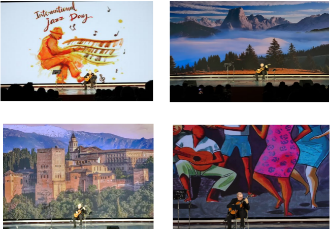接下来,埃瑞克·弗朗塞利教授以一组吉他独奏曲将吉他的表现力、感染力展现的淋漓尽致,既有《爵士咏叹调Jazz Aria》明快跳跃的旋律、畅快律动的节奏,也有旋律优美、气势磅礴俄罗斯传统音乐《黄骆驼》;既有古典吉他中最为著名的独奏曲之一的《阿斯图拉斯的传说》,也有特殊的节奏、独特的曲调旋律、丰富和声效果的《阿尔罕布拉宫的回忆》。