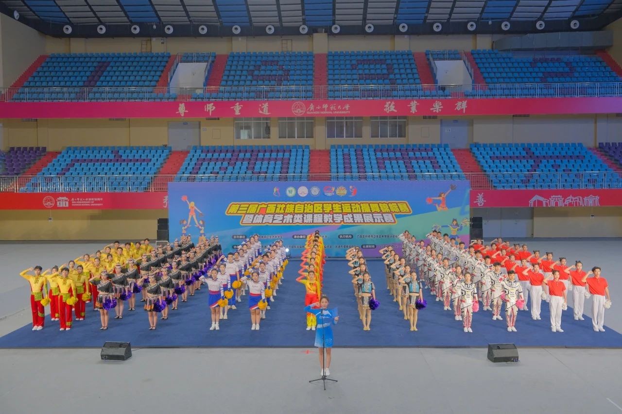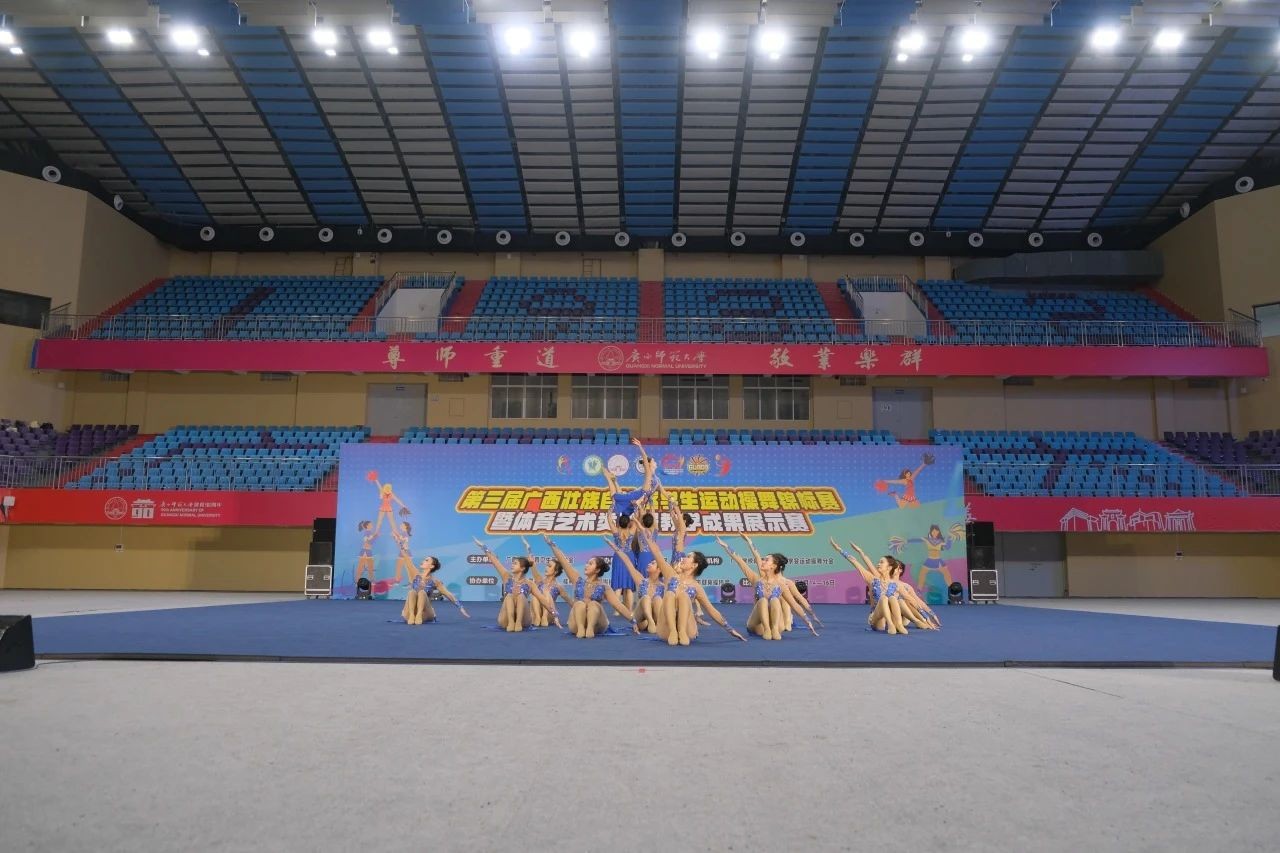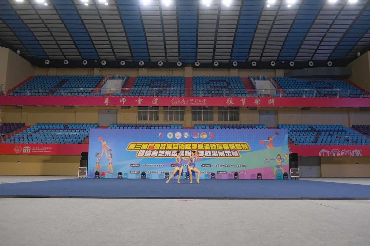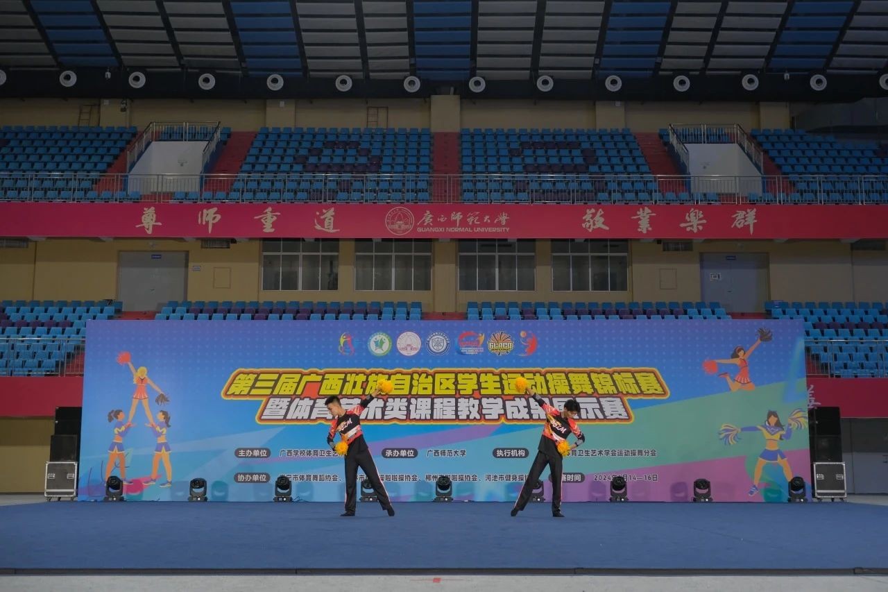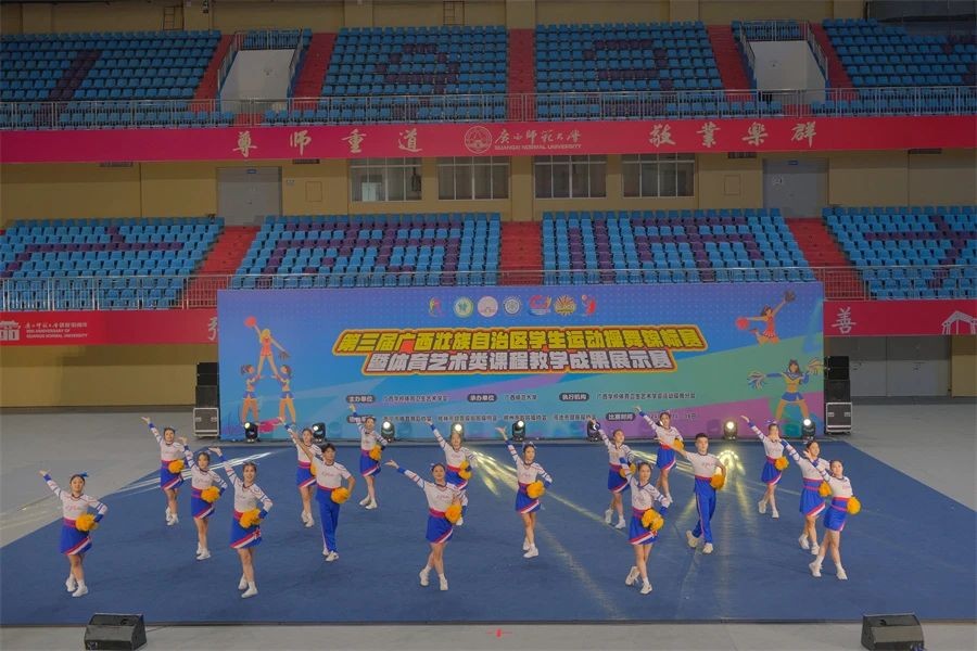 据悉,此次赛事由广西学校体育卫生艺术学会主办,广西师范大学承办,南宁市体育舞蹈协会、桂林市健美操啦啦操协会、柳州市啦啦操协会、河池市健身操协会联合协办。全区90支代表队、近1500余名运动员齐聚一堂,我校“战马”啦啦操队在领队杨莹、教练张文玉和覃柳芳的带领下,17名来自舞蹈表演专业的校啦啦操队员参与了5个大项的角逐,赛场上我校“战马”啦啦操队员们用整齐划一的动作、流畅的队形变化、富有创意的动作编排,精彩诠释了啦啦操的力与美,极富感染力的表现赢得了现场阵阵掌声。