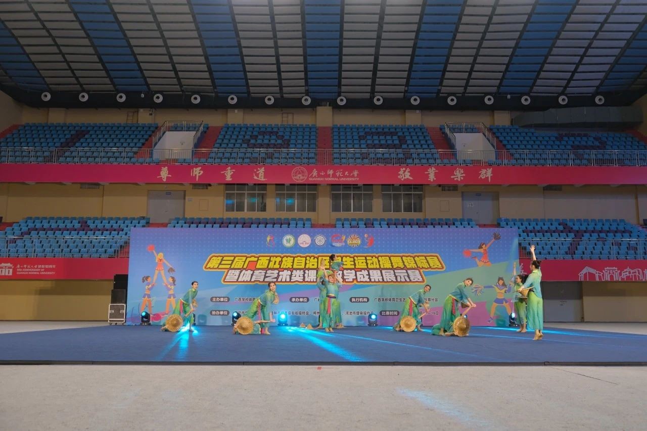 6月14-16日,第三届广西壮族自治区学生运动操舞锦标赛暨体育艺术类课程教学成果展示赛在广西师范大学雁山校区综合体育馆落下帷幕,我校“战马”啦啦操队斩获普通本科组“第九套广播体操、集体爵士自选、双人爵士自选、双人花球自选”4项冠军,民族民间舞季军,同时斩获“体育艺术类课程教学成果展示赛”二等奖。