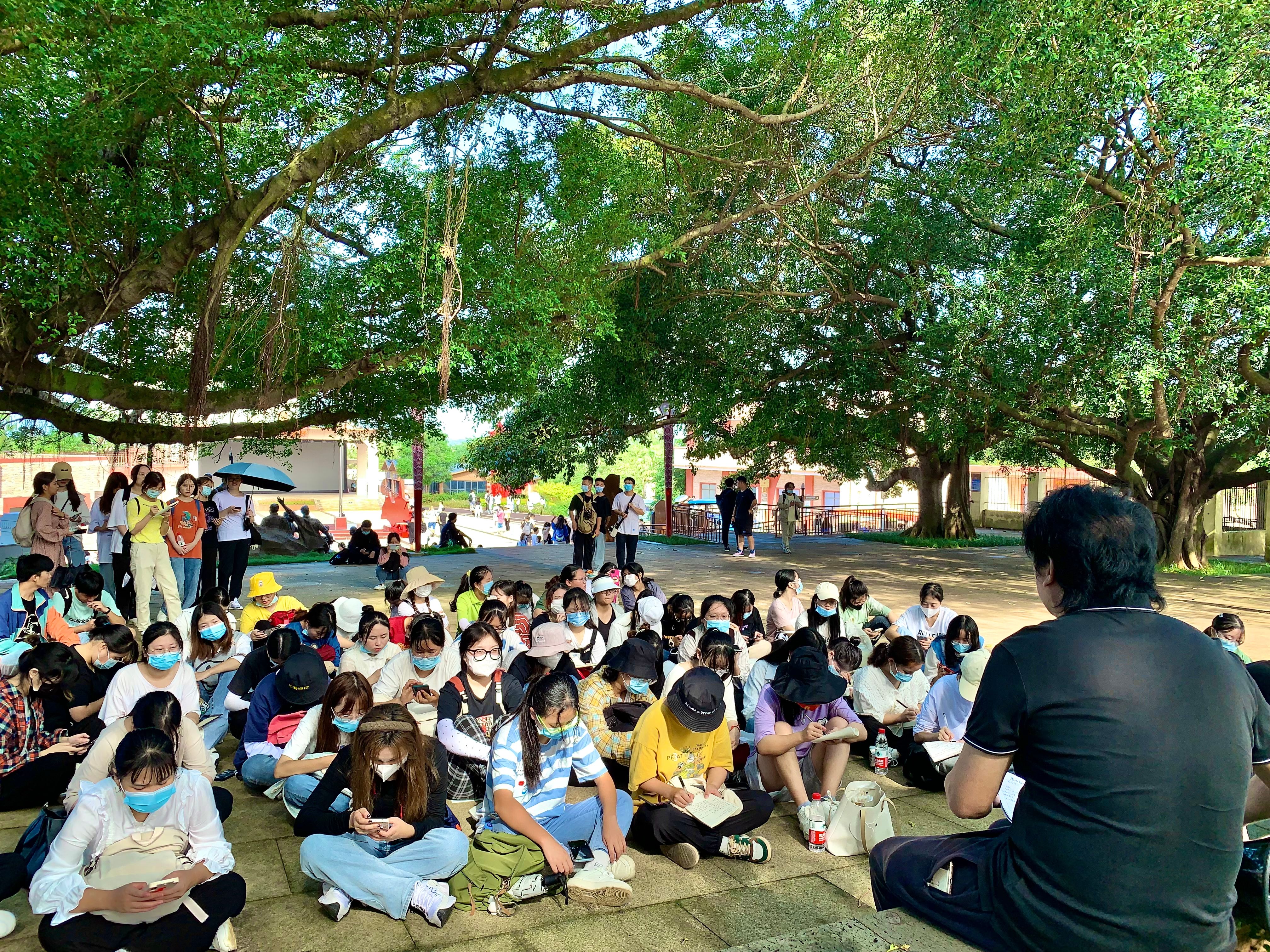 在烈士革命纪念碑旁边的大榕树下,我院陈敢教授为汉语言文学专业的同学做了题为《散文写作浅谈》的专题讲座。陈教授散文定义、散文类型、散文题材、散文表现对象、散文的写作要点、一篇优秀散文的写作要求等方面对散文写作做了深入浅出的讲解。陈教授认为一篇好的散文首先应满足以下要求:情感真挚、选材合理、语言晓畅、蕴含深度哲理、透视人性的复杂性、反映生活的真谛。同学们仰望着烈士纪念碑,聆听着陈教授的讲座,在微风不躁、秋光明媚的红色广场忆先辈舍生忘死之义,悟文学创作之道。