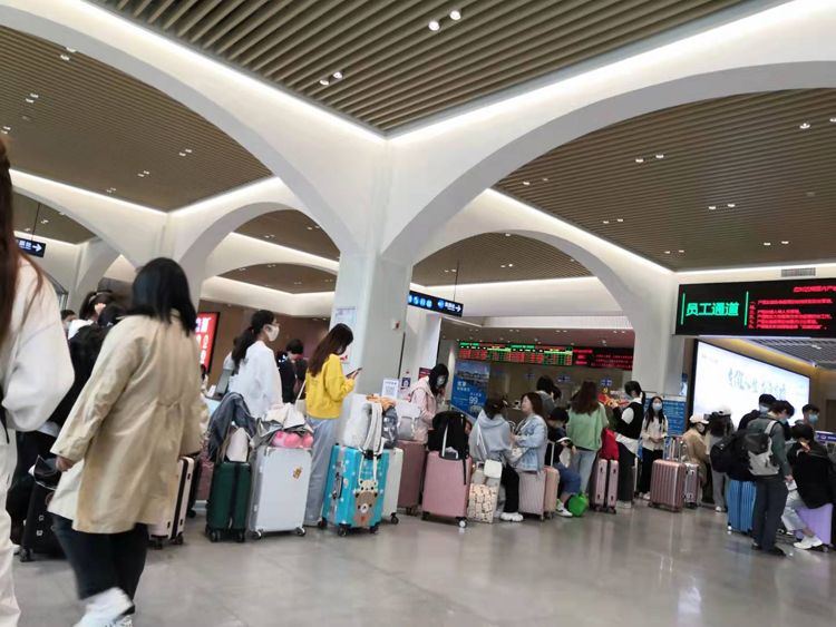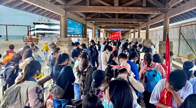 学生在码头等待安检)