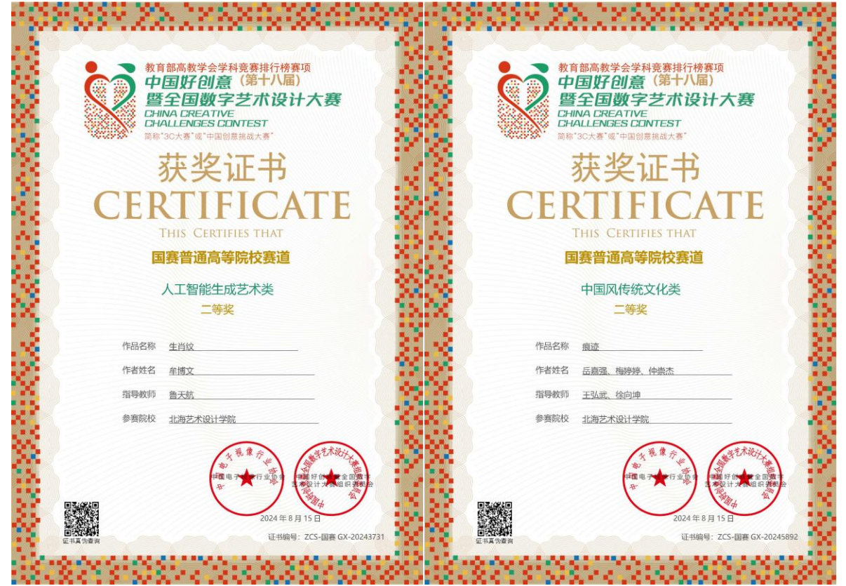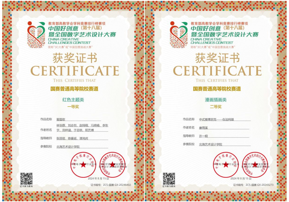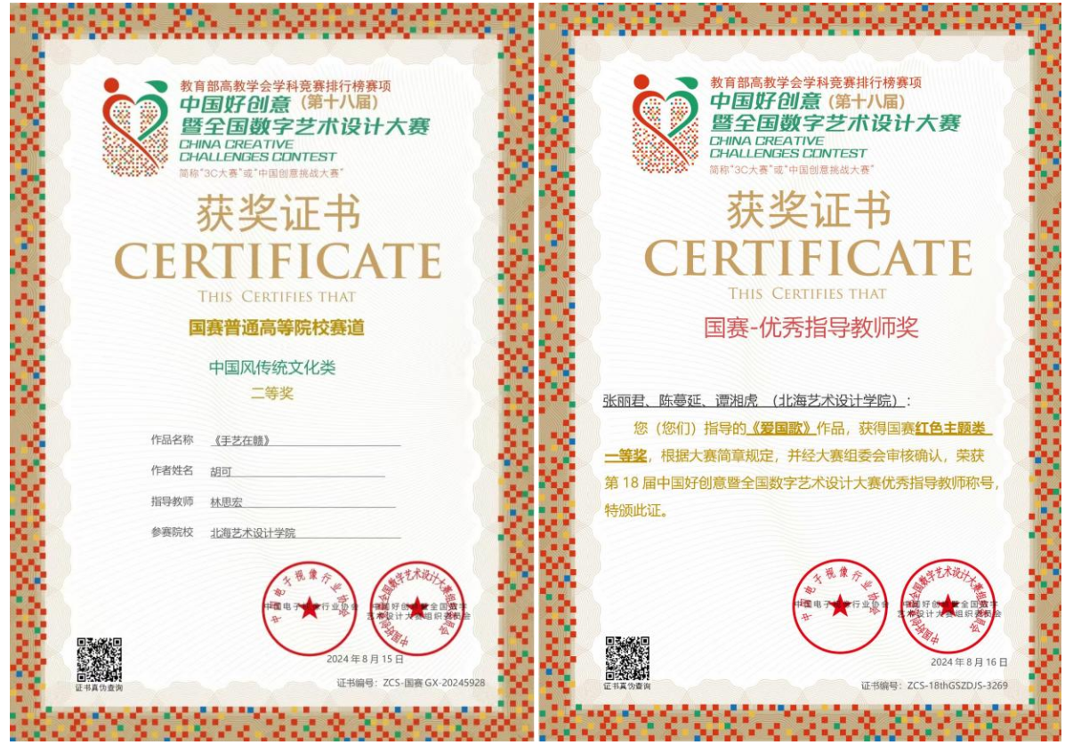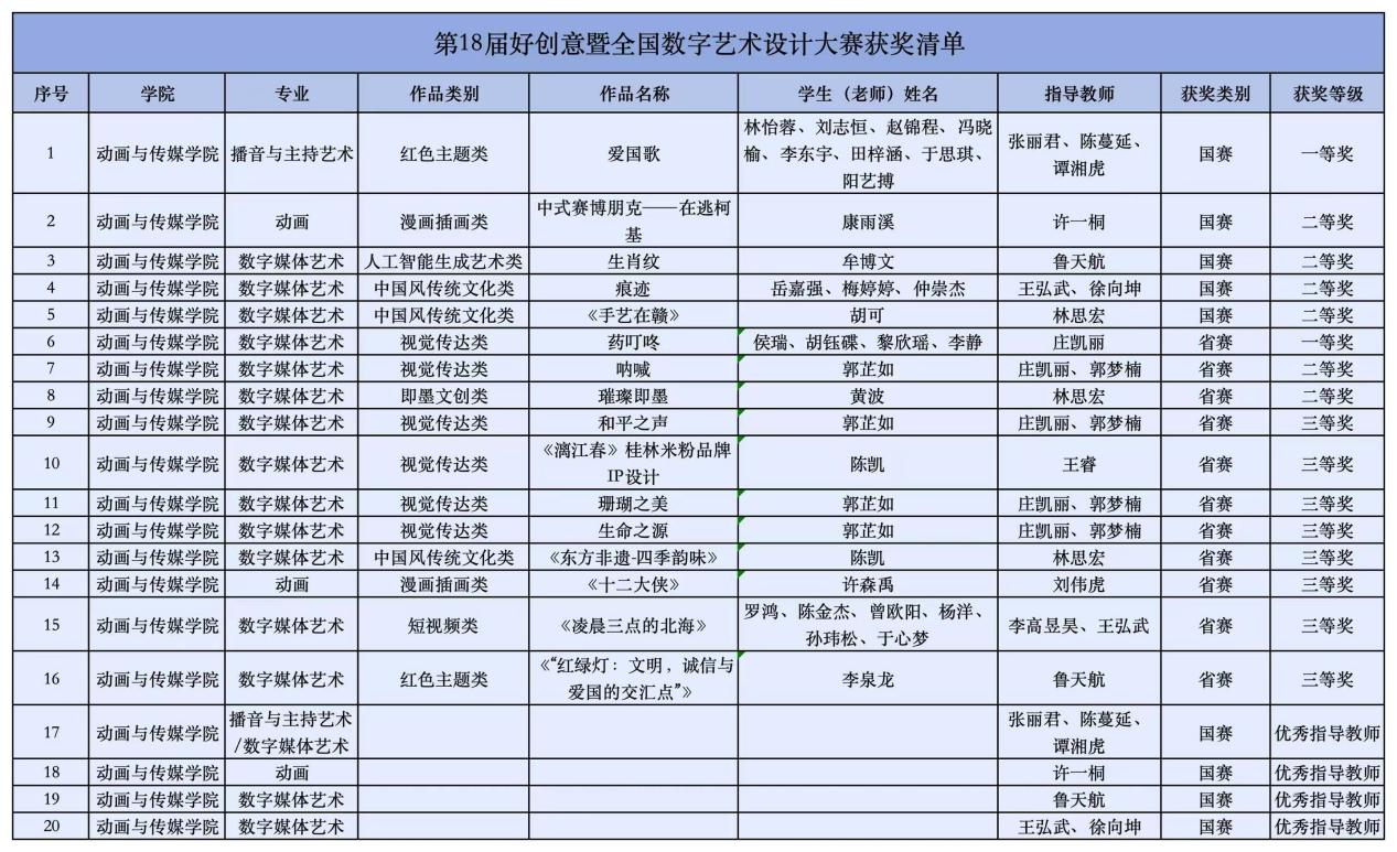 在第18届好创意暨全国数字艺术设计大赛中,动画与传媒学院作品《爱国歌》斩获国赛一等奖,作品《中式赛博朋克——在逃柯基》《生肖纹》《痕迹》《手艺在赣》荣获国赛二等奖,《药叮咚》《呐喊》《璀璨即墨》等11件作品荣获广西壮族自治区省赛奖项。学院张丽君、陈蔓延、谭湘虎、许一桐、鲁天航、王弘武、徐向坤7名老师获评为优秀指导教师。