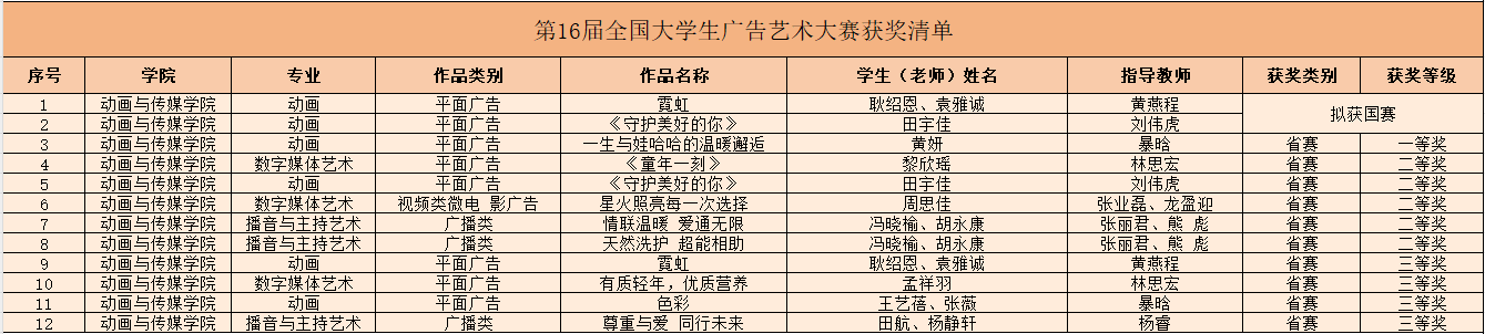 在第16届全国大学生广告艺术大赛中,动画与传媒学院作品《霓虹》荣获国赛三等奖、作品《守护美好的你》荣获国赛优秀奖,《一生与娃哈哈的温暖邂逅》《童年一刻》等10件作品荣获广西壮族自治区省赛奖项。