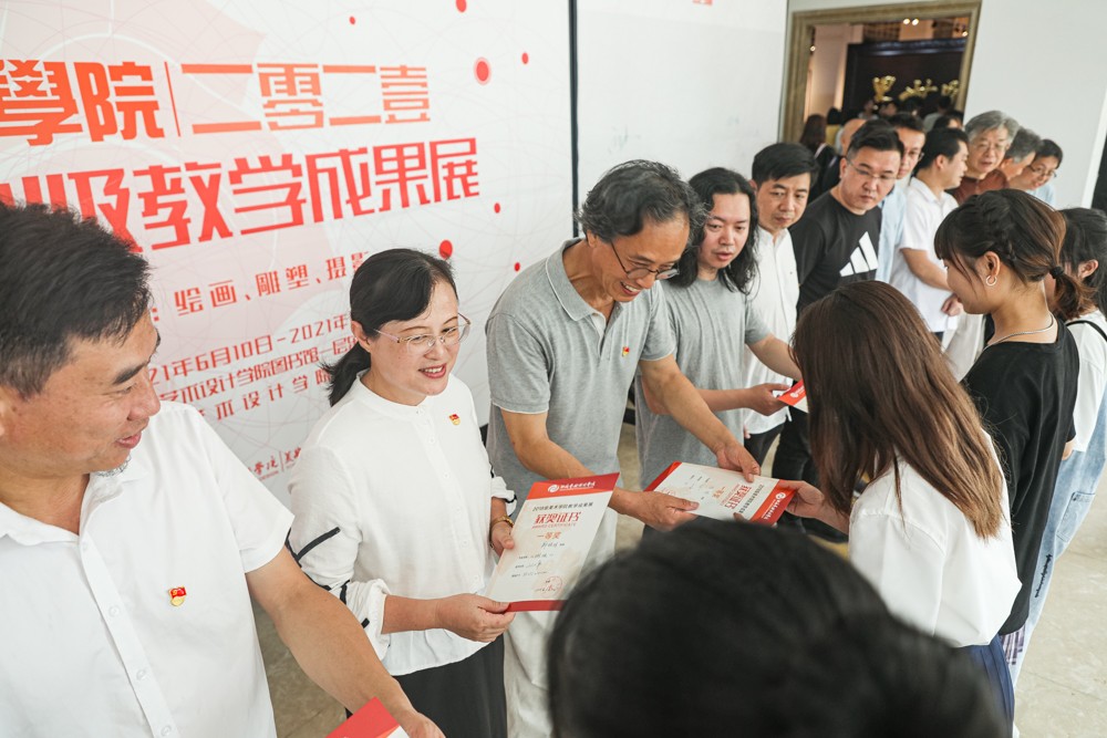 2021年6月10日(星期四)下午四点三十分,美术学院2018级教学成果展于西校区图书馆一楼展厅隆重开幕。展览展出2018级雕塑作品31件,摄影作品180幅,绘画作品83幅。党委书记张阳、校长卢新华、党委副书记副校长彭仁、副校长胡胜、陶立阳、王斌、邱杰、黄侃明、设计学院常务副院长李林平、环艺学院常务副院长王照伟、动画学院党总支书记副院长杜博、马克思主义学院院长姜献生、人文学院常务副院长李水亮、美术学院巫维轩、崔君旺教授、美术学院常务副院长龚为等领导,以及美术学院全体教师同学们参加此次活动。