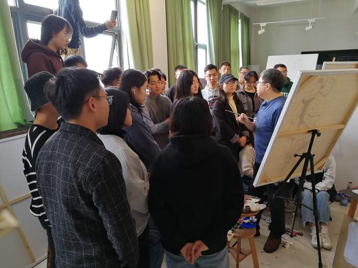 之后,美术学院常务副院长龚为、学工办主任袁志伟及美术学院绘画专业教师陪同计宇教授参观了绘画18级教学区,并进行教学指导。