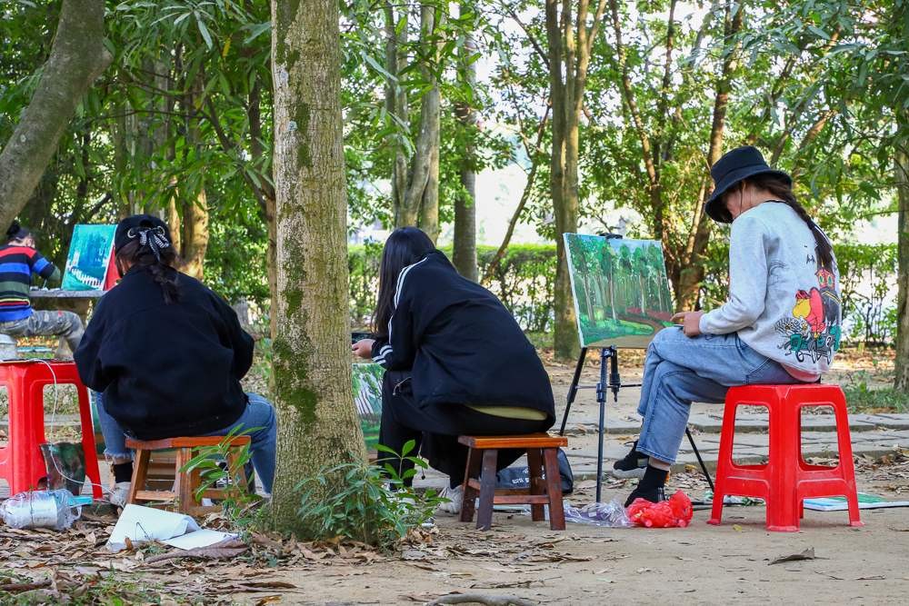 本次校园写生活动为期五天。师生分别集中在东、西校区取景作画进行写生。入冬后,空气中夹杂着丝丝冷意,北风也加快了南下的步伐,略带寒风,可是没有影响到同学们手中的画笔,他们或是坐在绿荫下,亦或是在校园路旁,三两成群,安静作画。
