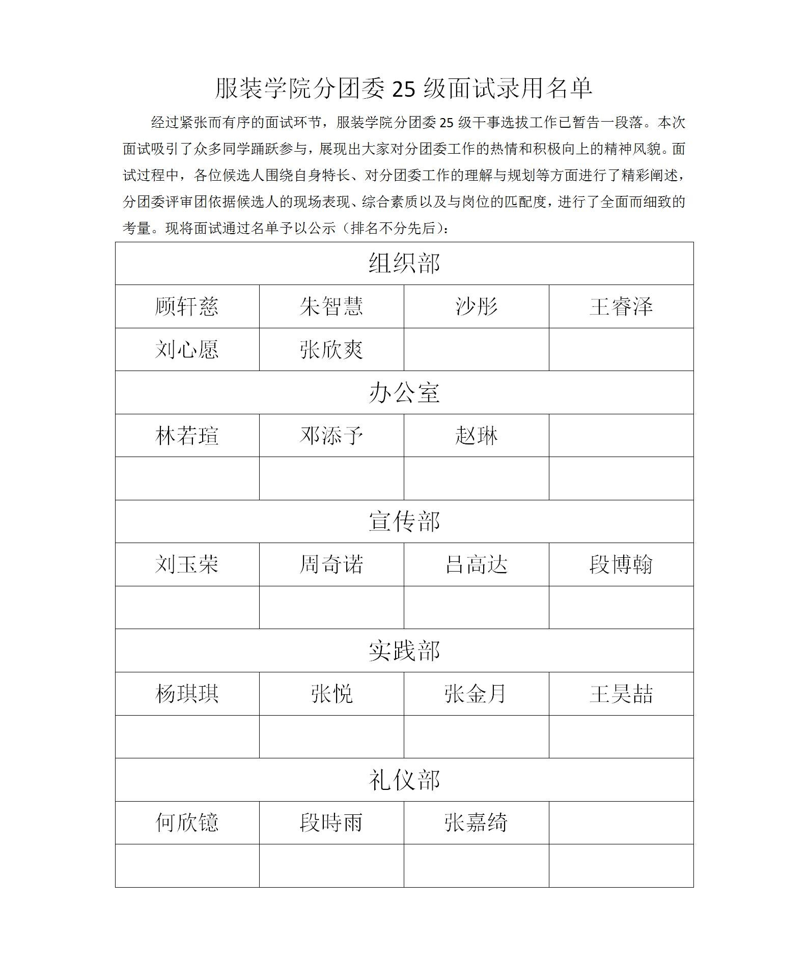 服装学院分团委25级面试录用名单