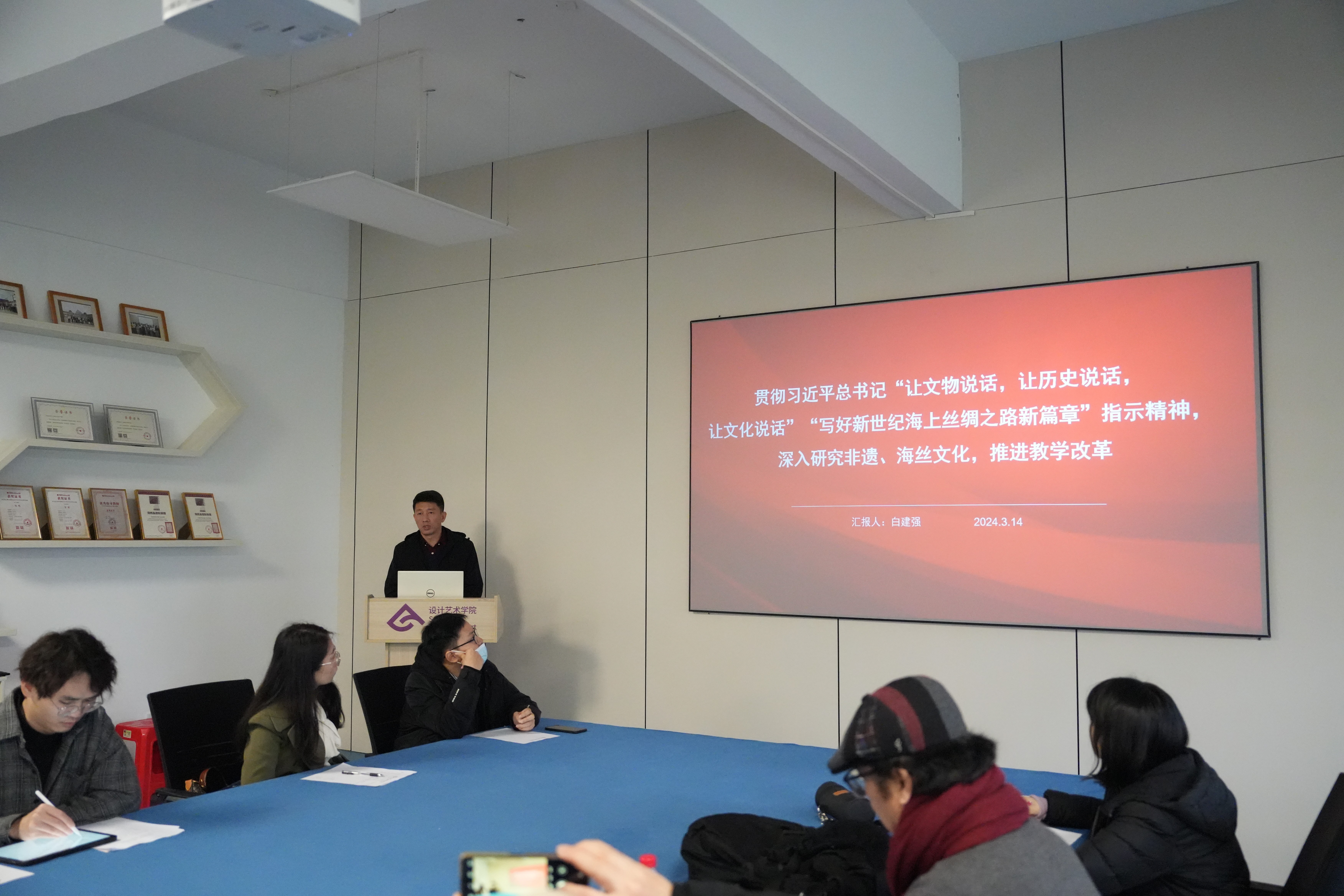 白建强副院长汇报了非遗与海丝文化研究与教学的思路、教学改革的方向与进展情况。他提到团队将深入挖掘北海地区的非遗与海丝文化,开发具有时代性与地域特色的课程,培养具备非遗技艺和海丝文化素养的专业人才。