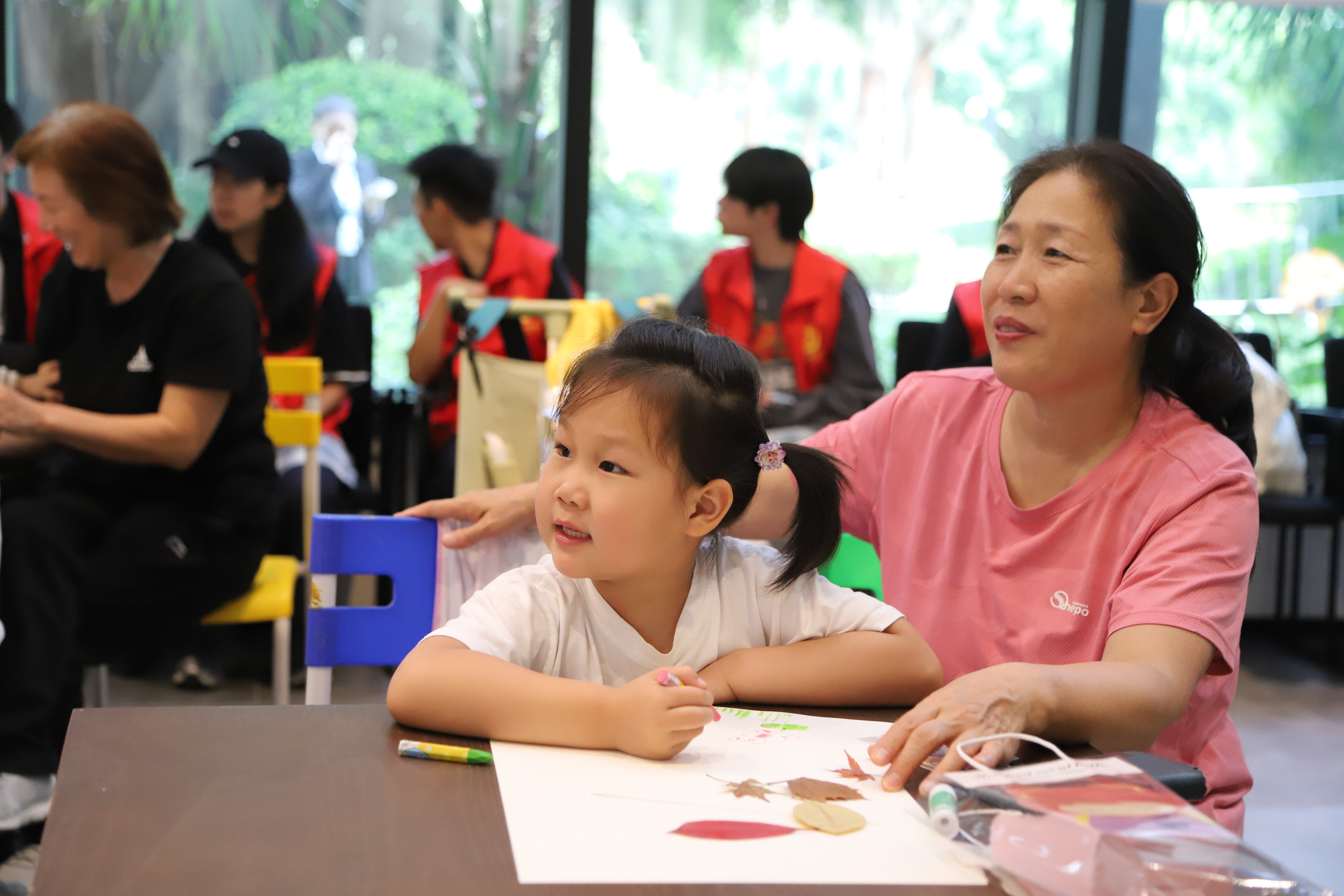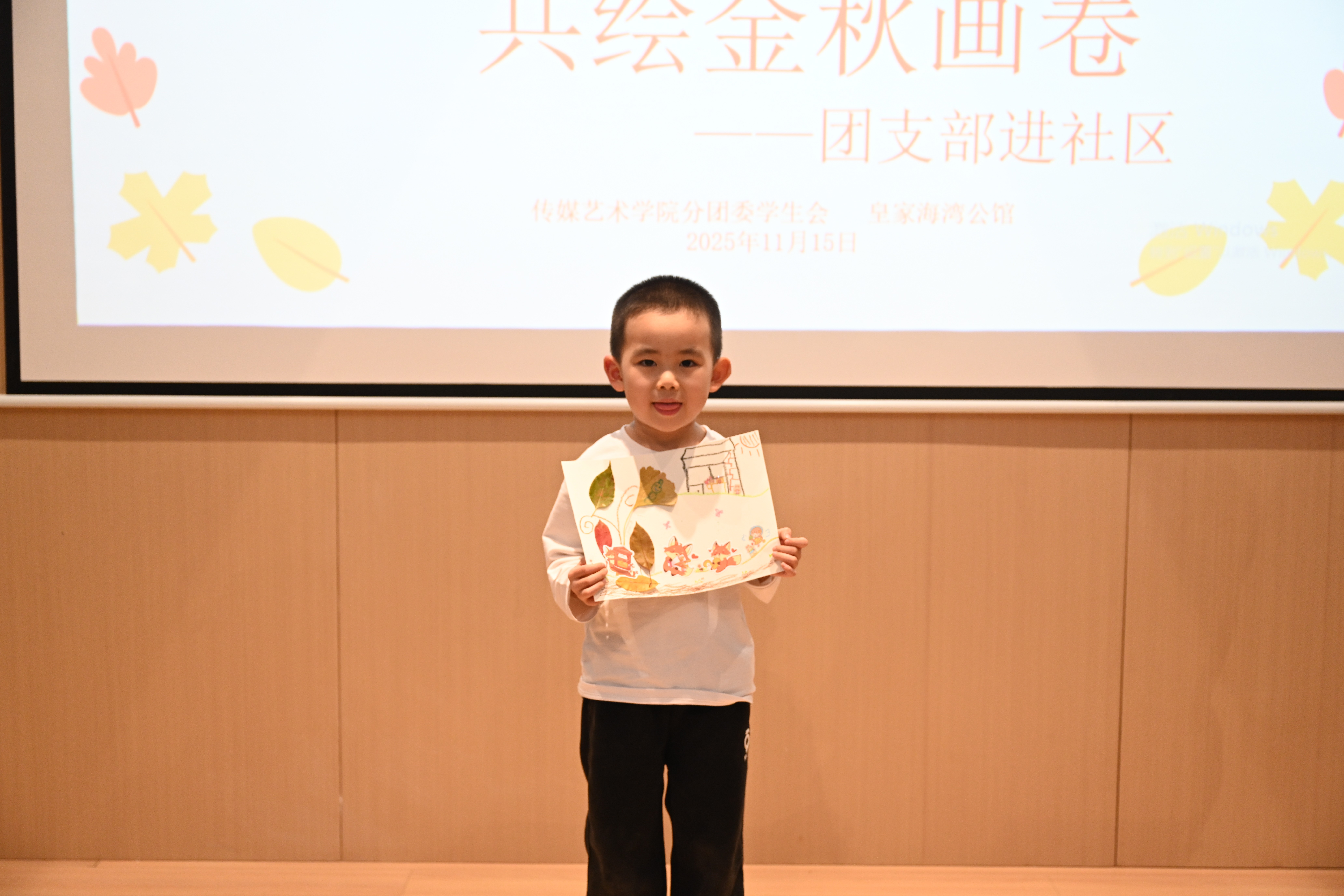 亲子绘画”在社区共享会议室温馨开启。传媒艺术学院的志愿者们充分发挥专业特长,化身“艺术导师”,引导孩子们以“我眼中的秋天”为主题展开创作。在志愿者一对一陪伴下,小朋友们挥洒童真色彩,将金黄的落叶、高远的蓝天、欢笑的家人一一呈现在画纸上。现场氛围温馨融洽,原本静谧的空间化作流动的色彩海洋,洋溢着浓厚的艺术气息与亲子温情。
